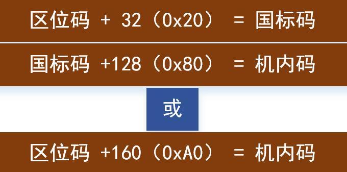 从区位码(国家标准定义) ---> 区码和位码分别+32(即+20H)得到国标码 ---> 再分别+128(即+80H)得到机内码(与ACSII码不再冲突)。