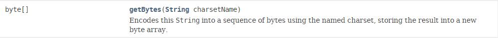 这个方法的作用是:使用参数指定的字符集,来编码这个String,称为一个字节序列,并把结果保存在一个字节数组中。
