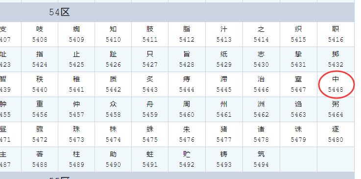 在54区48位,所以“中”字的区位码是:5448(注意,GB类汉字编码为双字节编码,因此,45相当于高位字节,82相当于低位字节)。