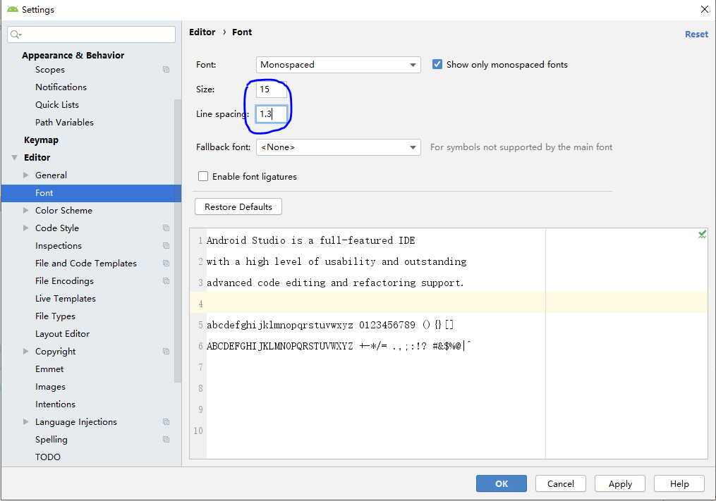 以上就是羞涩黑夜最近收集整理的关于最新版本Android Studio字体设置新手入门2的全部内容,更多相关最新版本Android内容请搜索靠谱客的其他文章。