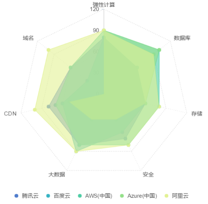 各家云计算厂商都有自己的优势业务,AWS 的数据库、Azure 的弹性计算、阿里云的稳定性和AI能力、腾讯云的场景化、百度云的人工智能,还有未上榜的华为云也有一定潜力。相比之下,AWS和阿里云的各项能力最为均衡,也是业内追赶的目标。