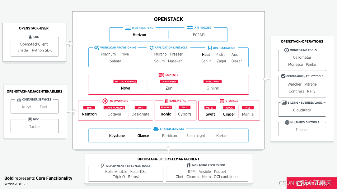 OpenStack它最先由美国国家航天局(NASA)和Rackspace在2010年合作研发的,旨在为公有云和私有云提供软件的开源项目。OpensStack是一个IaaS层的软件,其目标在于提供可靠的云部署方案及良好的可扩展性,从而实现类似于Amazon 或者阿里云的云基础架构服务。最终目标是