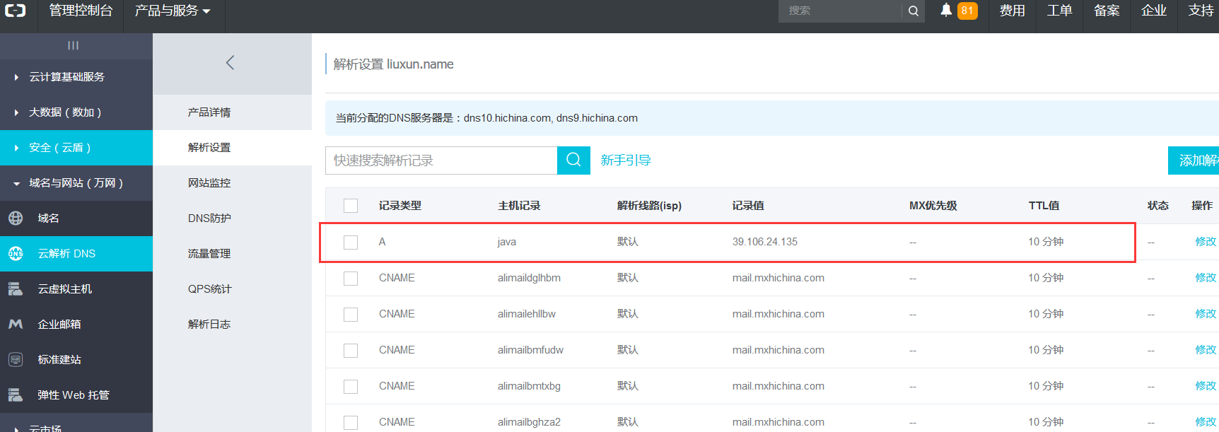 1. 找到云服务器ECS 的公网IP -> 2 .云解析DNS中新增一条记录(第三张图),OK了。