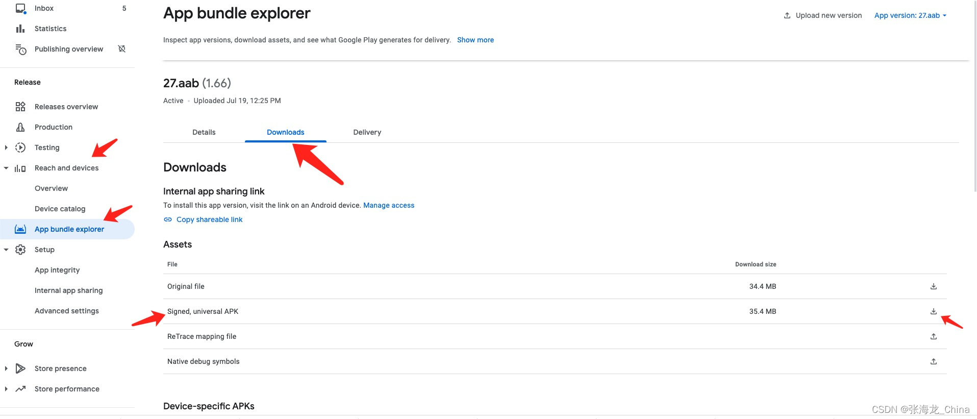 2.就是下载对应的APK了:进入到Google Play Console 控制台中 ---->APP bundle explorer --->downloads --->signed,universal APK 点击download 获得的就是Google play 签名后的APK