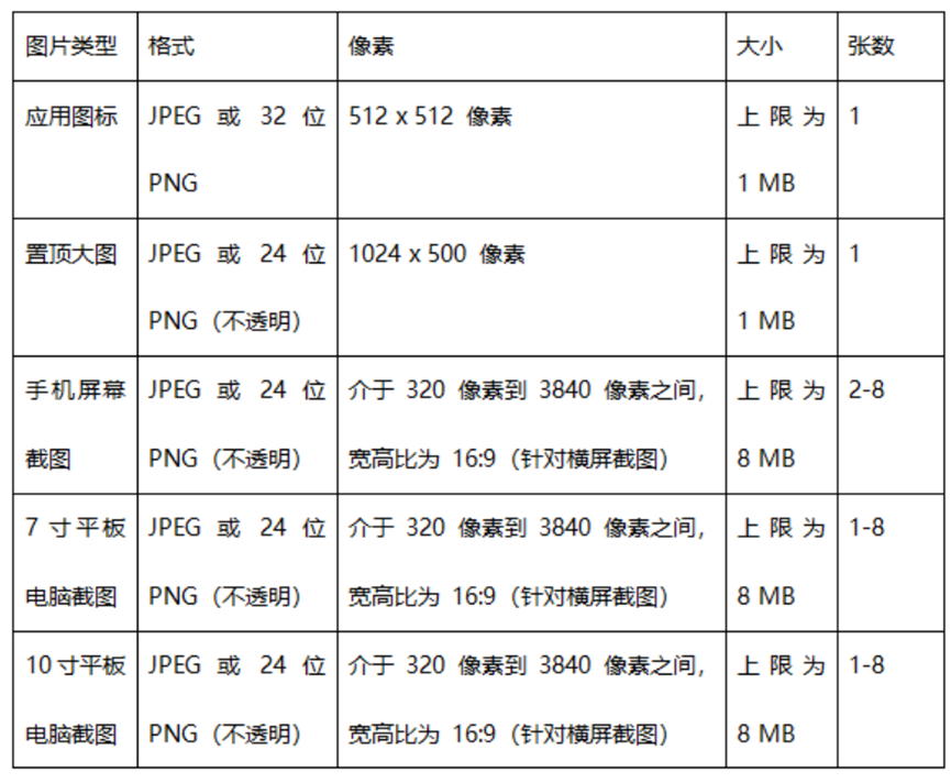 这个和国内上架需要素材的需求差不多,重点就在尺寸和大小方面,直接看下图。