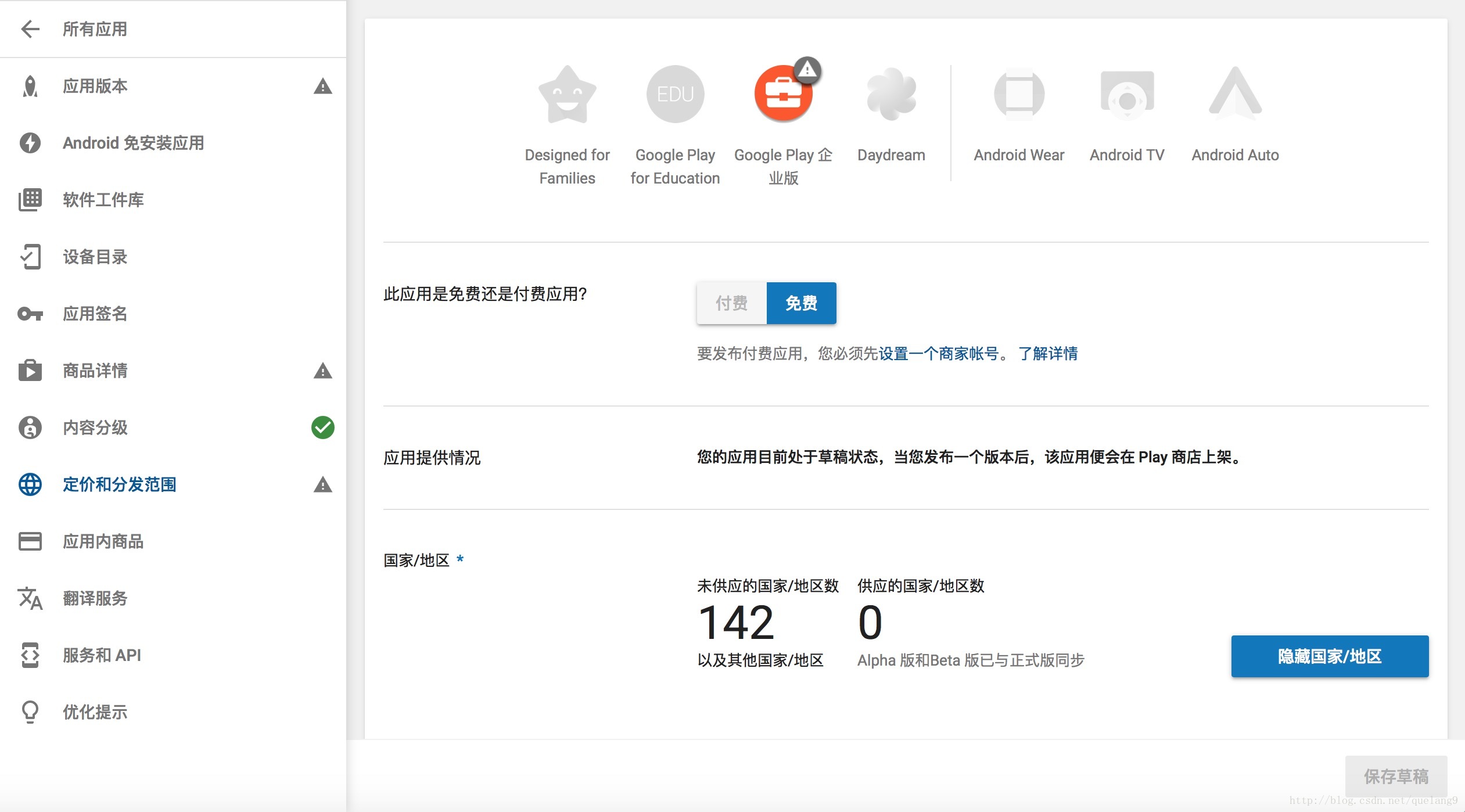 到现在为止我们就还差最后一个“定价和分发范围”了,还是在左边导航栏选择“定价和分发范围”: