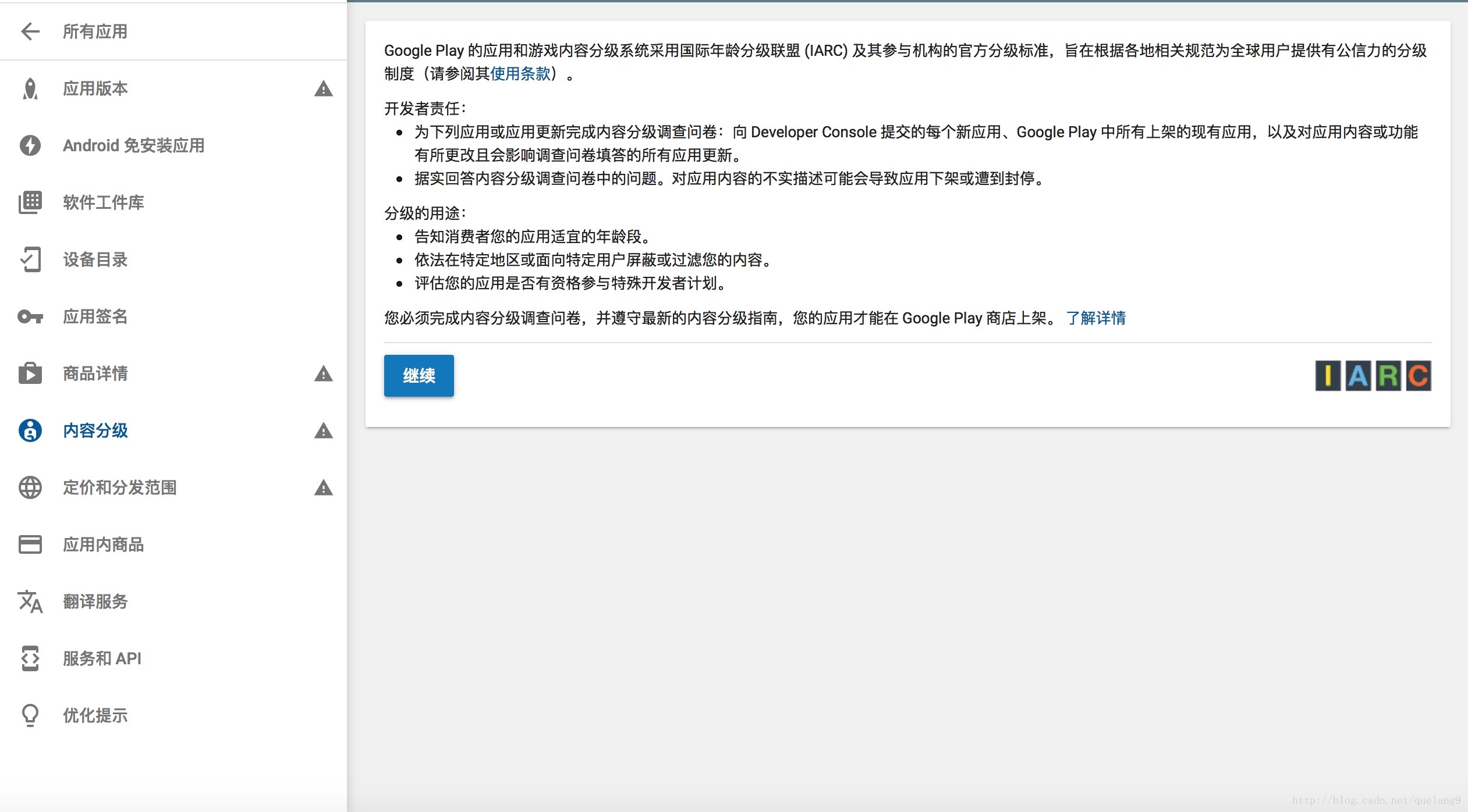 上传完毕后,版本号和版本名称就自动录入到填写内容中了,然后你需要填写的是“此版本中有哪些新功能”,这也没什么可说的,现在就可以去填写内容分级了。点击左边导航栏的“内容分级”: