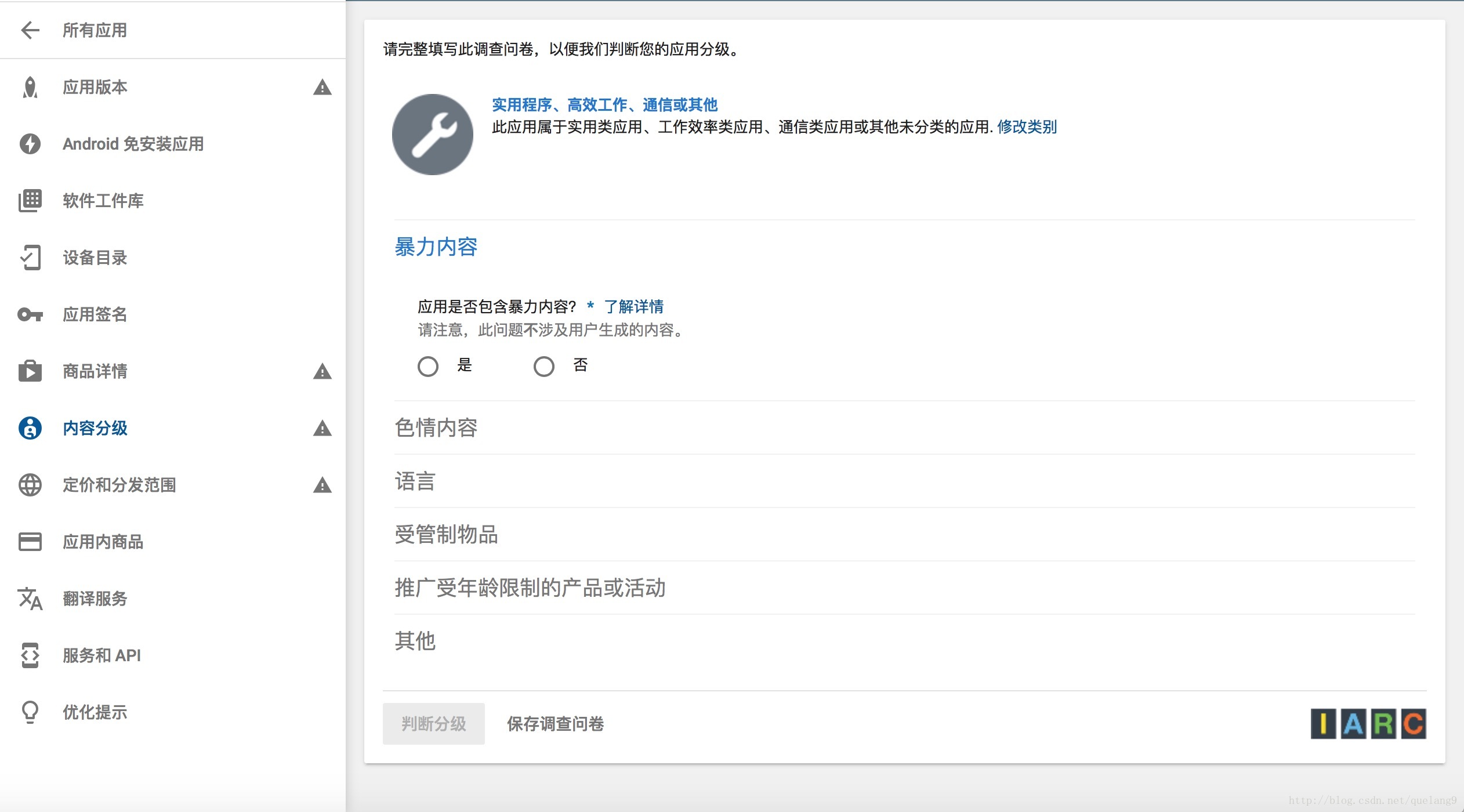 填写电子邮件地址,这个邮件地址用来接收Google Play发送的消息,例如你的App已经通过审核了的消息。然后选择你的应用类别,点击对应应用类别后会进入调查问卷页: