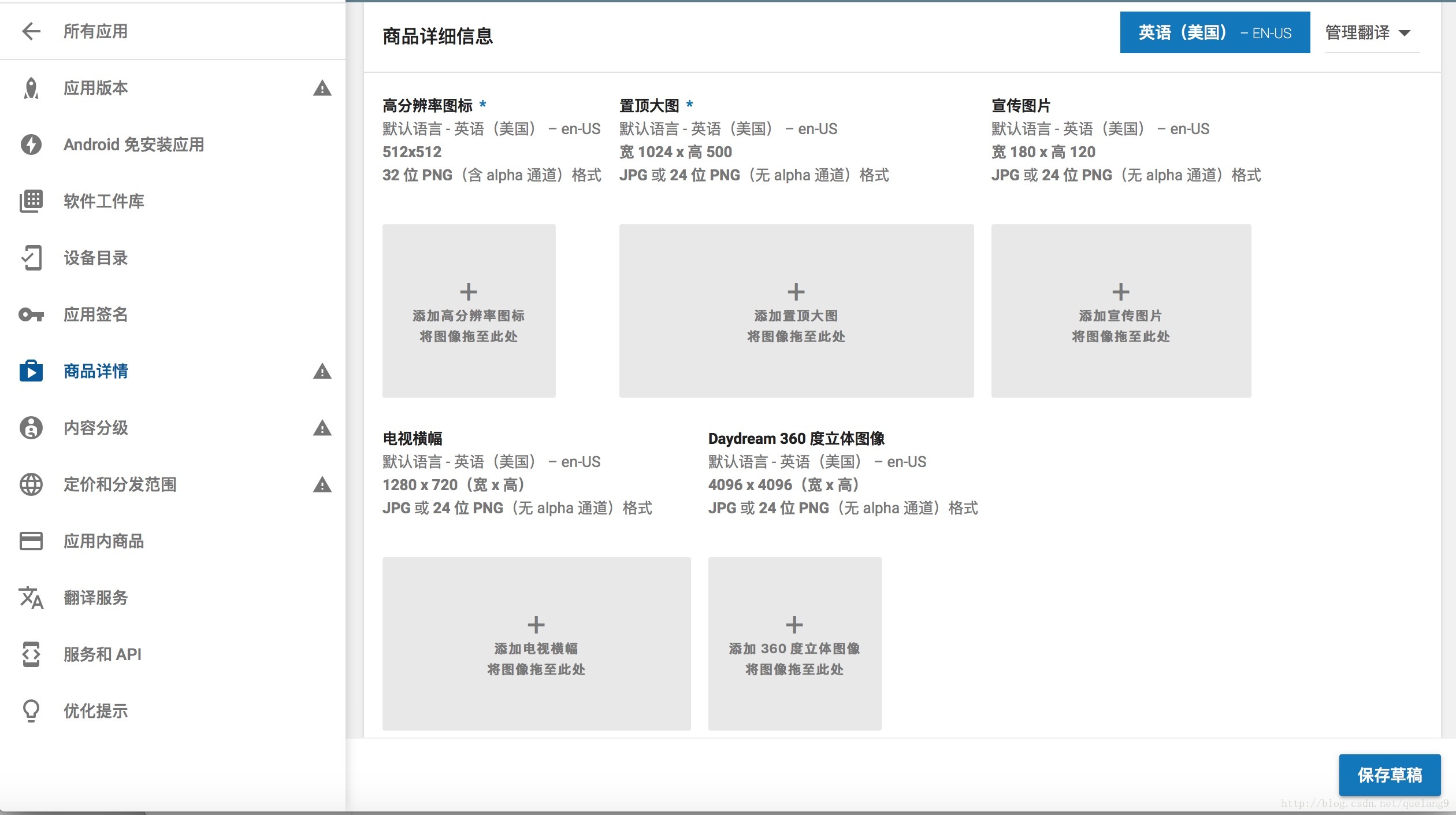 上传屏幕截图、高分辨率图标、置顶大图。(这3项是必传内容,做为一只猿类生物,我们只需要把这个截图给设计看就好了,设计准备好图我们直接上传OK了~)