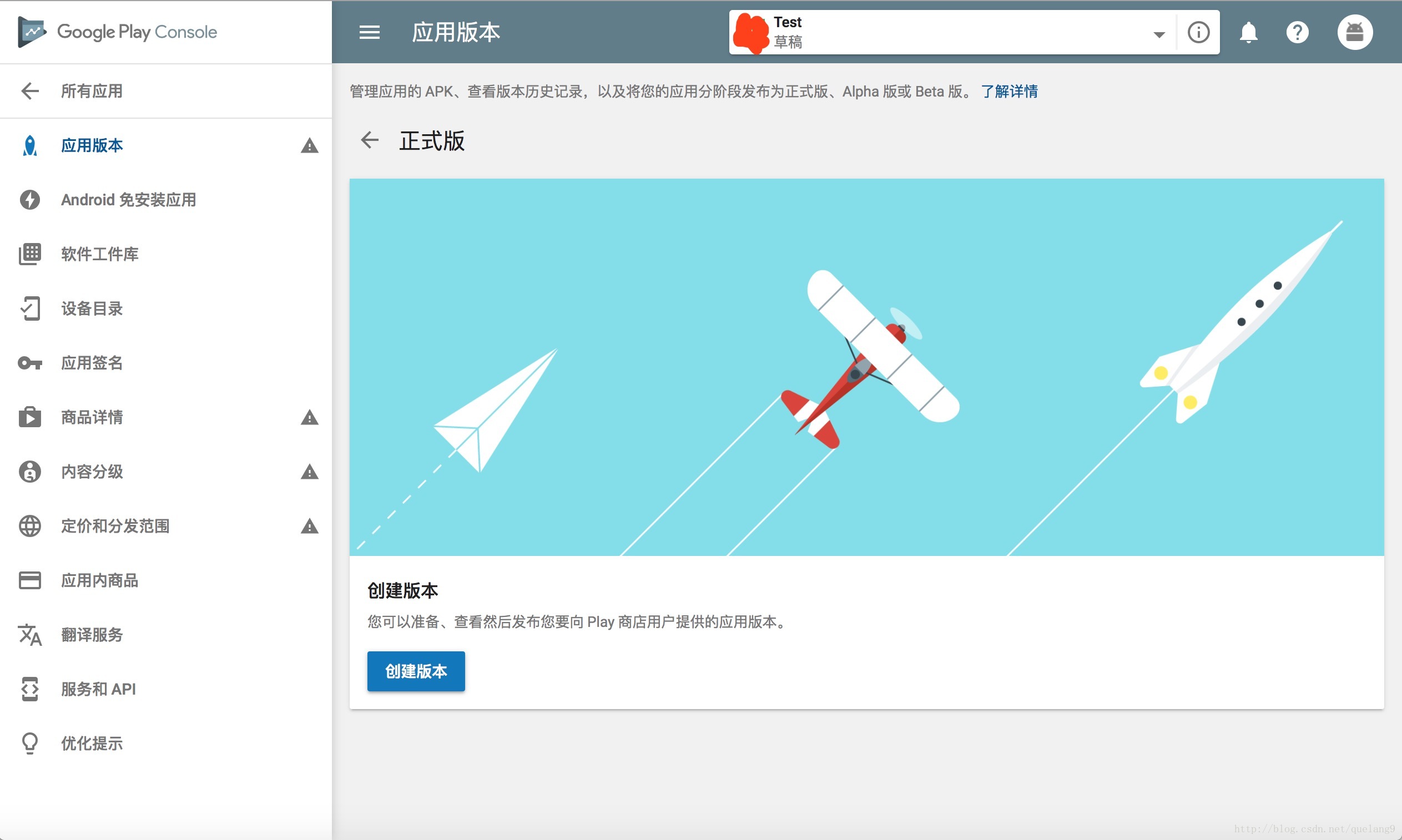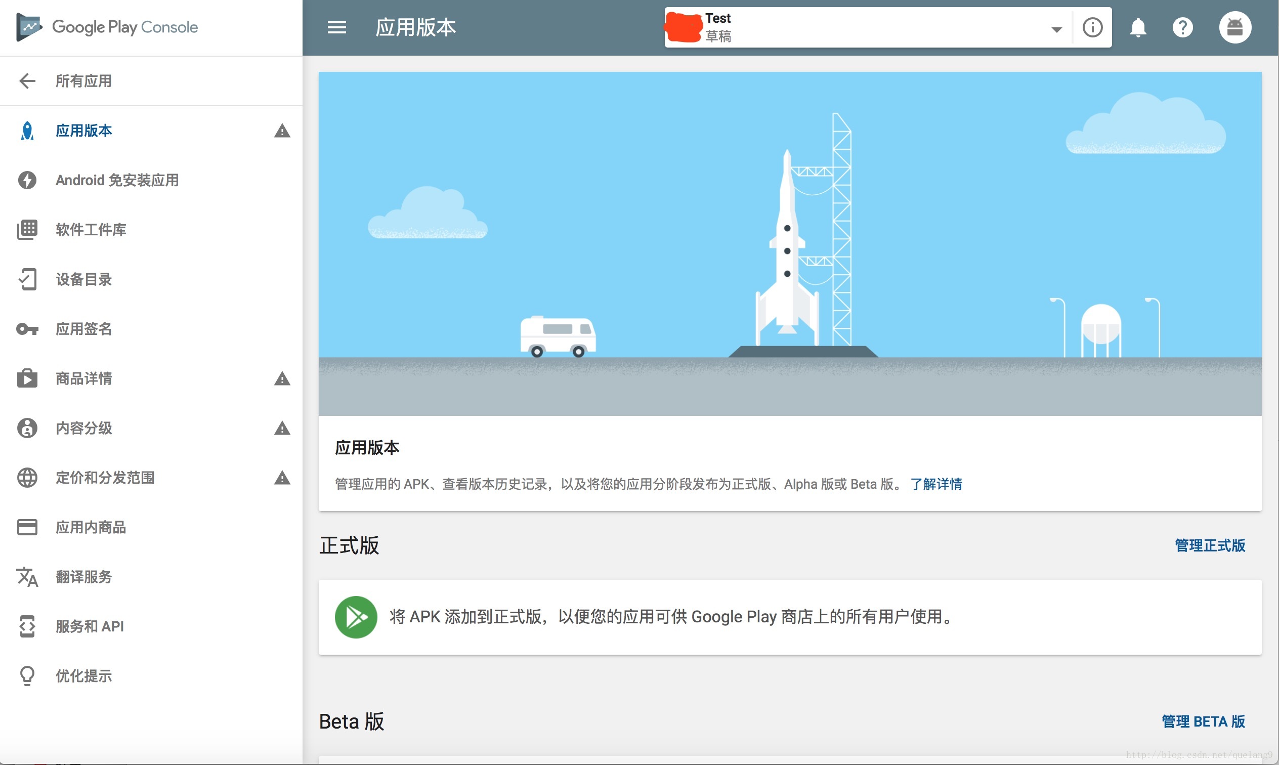 应用版本页面有3块内容,分为正式版、Beta版、Alpha版本。正式的App建议在内测阶段先上传Alpha和Beta版本,因为Google可以提供免费的云测。这里我们直接点击管理正式版本: