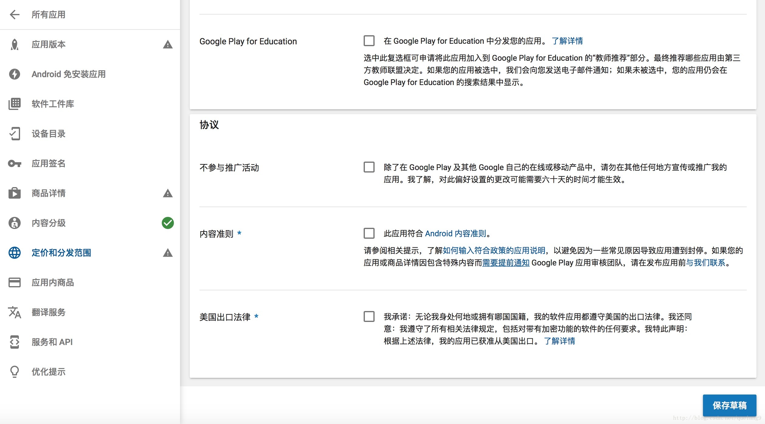 内容准则和美国出口法律是必须要选中的,最后我们保存草稿。