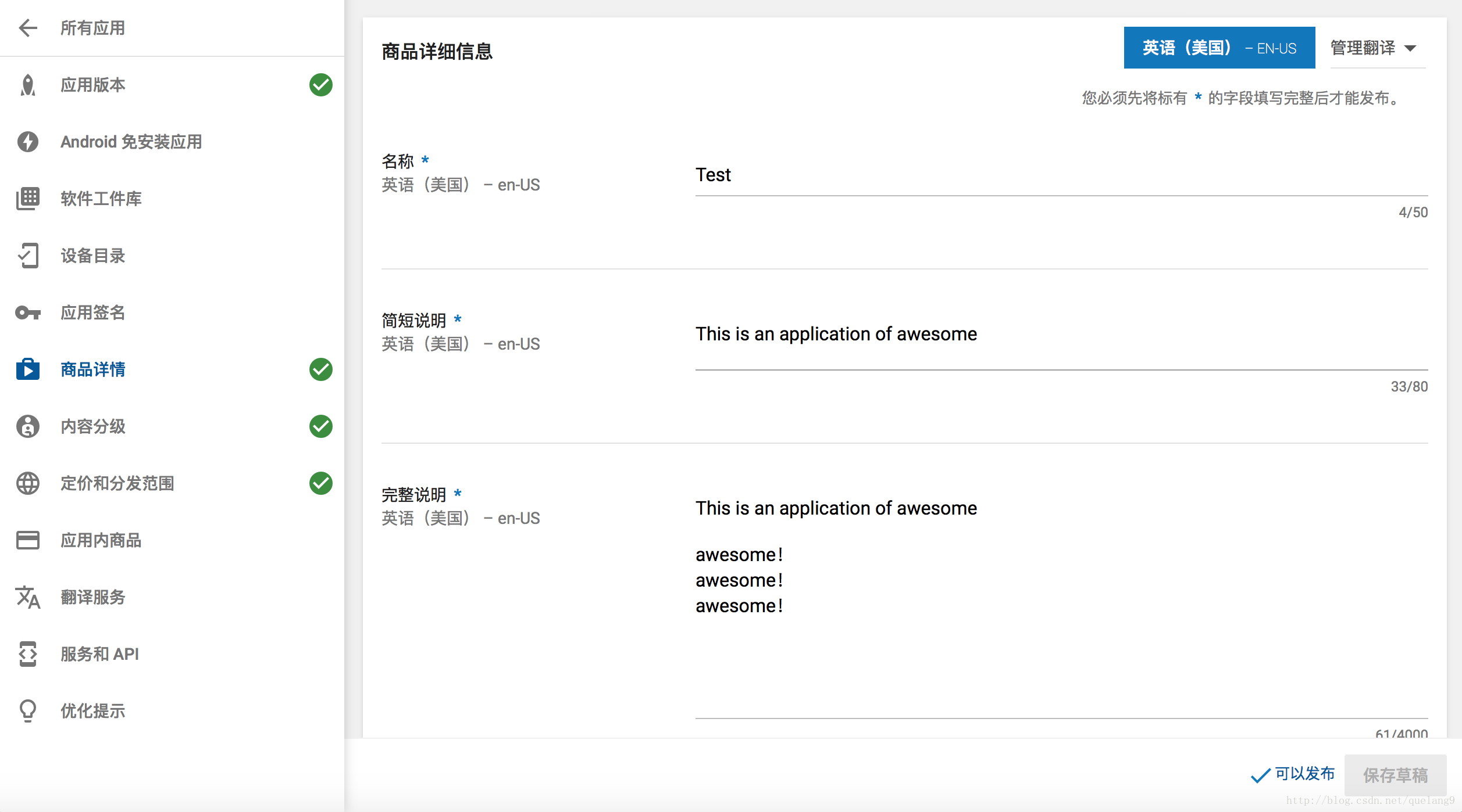 如果所有内容都填写正确,我们会看到左边导航栏4个绿色对勾,并且出现“可以发布”按钮: