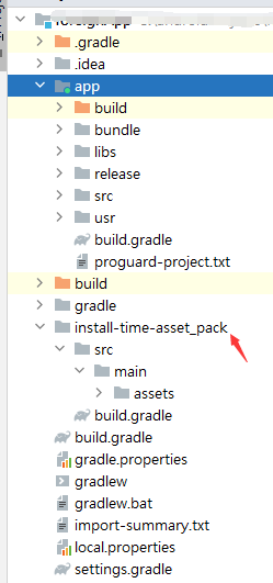 在project(build.gradle项目级)的目录下创建install-time-asset_pack的文化夹,并在此文件夹下依次创建src、main、assets文件夹