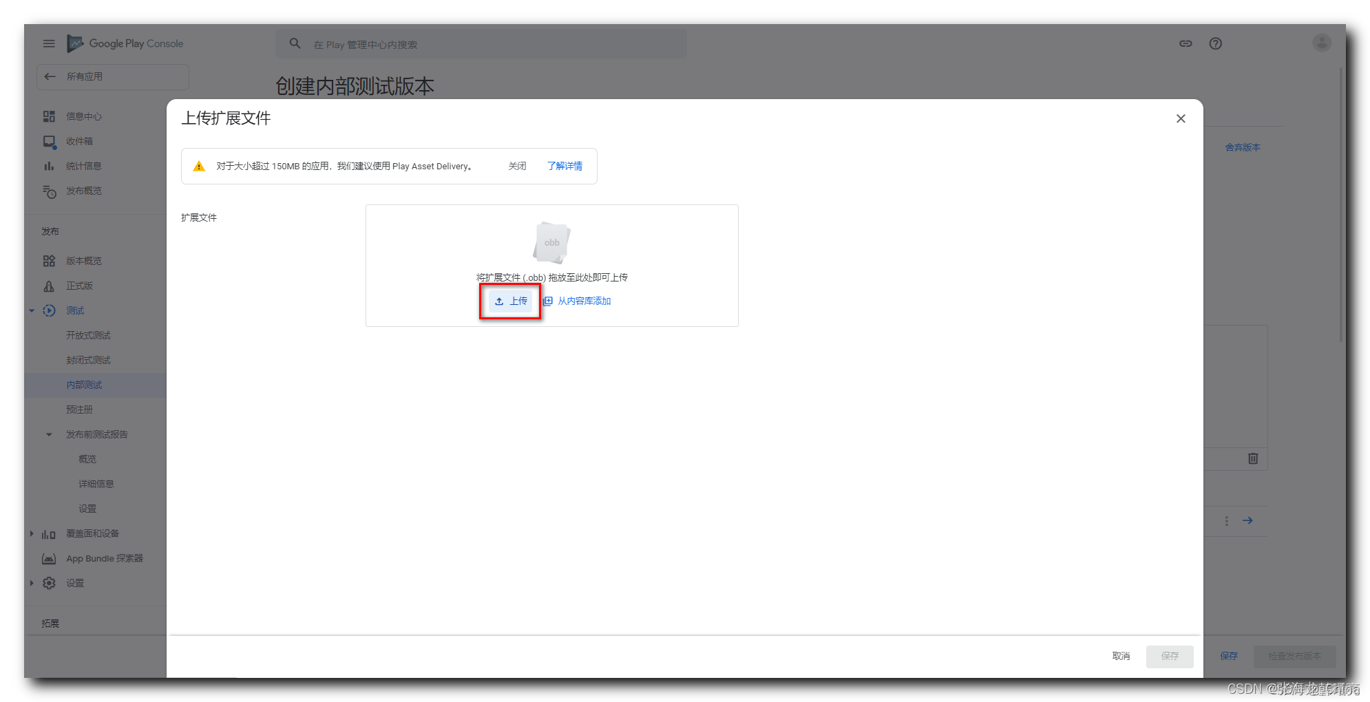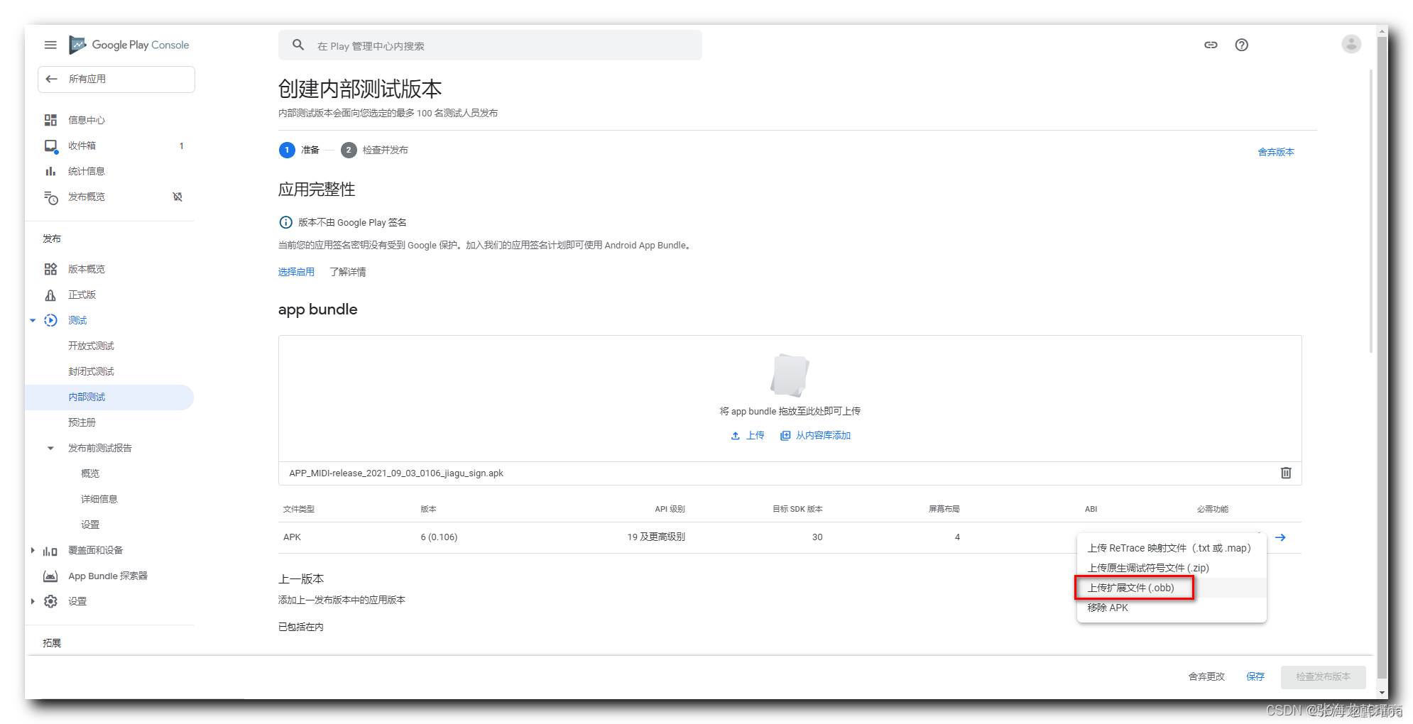 上传完APK后 有个更多 点击更多,选择上传扩展文件(.obb)