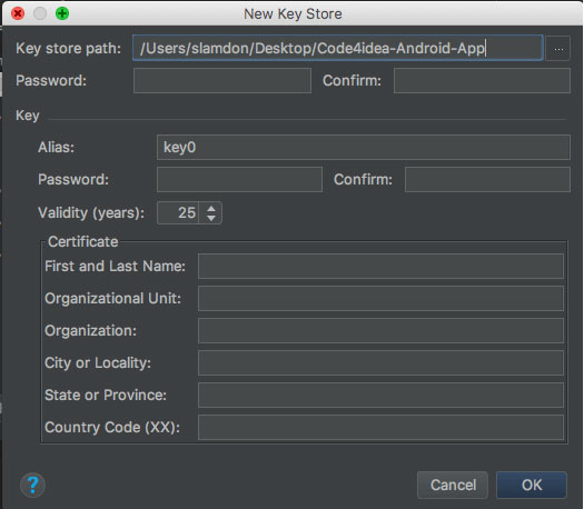 这里不像iOS开发那样方便,签署App的密钥需要有自己来管理,万一之后钥匙丢了,再继续更新已经上架的App就比较麻烦了。