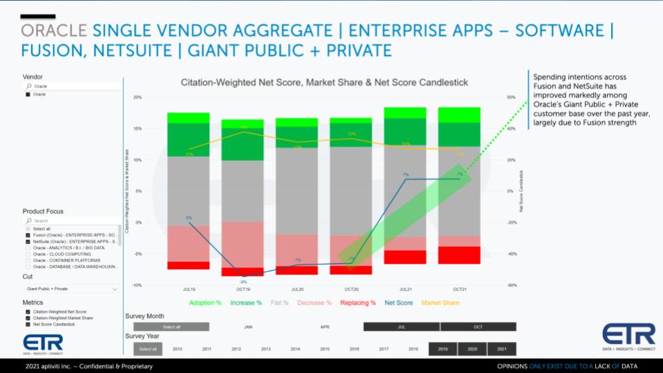 上图将 Fusion 和 NetSuite 隔离在 ETR 调查的 GPP 部分。GPP 指的是非常庞大的上市公司和私营公司的ETR数据集风向标。想想大型上市公司和比如玛氏(Mars)、嘉吉(Cargill)或富达(Fidelity)这样的私有企业。图表显示了2019年以来 Fusion 和NetSuite 的净得分分解情况,可以从2020年10月的调查中看到一个大的上升趋势。因此,Oracle在构建和现在向这些重要客户营销其 ERP 方面做得很好;这证实了Oracle在其电话会议上讨论的上升势头。