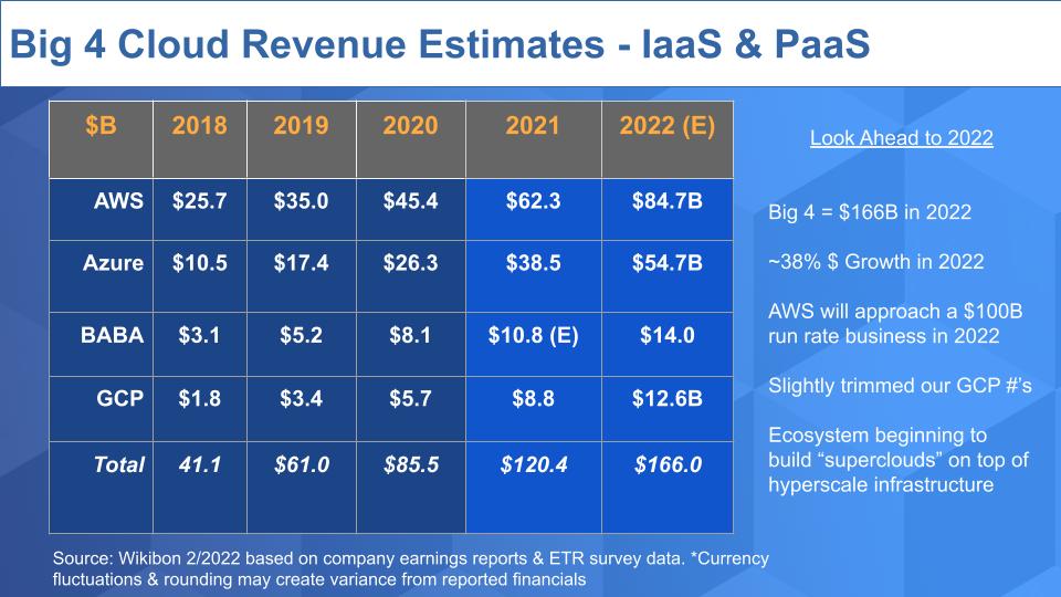 回到上面的表格。基于比较Alphabet在最近几个季度的一些声明和其它导致Wikibon不那么乐观的调查数据后,Wikibon略微向下调整了GCP数据。只有阿里巴巴尚未公布营收,因此Wikibon将保持2021年约1200亿美元的市场规模预测,相对于2020年增长41%。Wikibon预计这一数字在2022年将增长38%,达到1660亿美元。