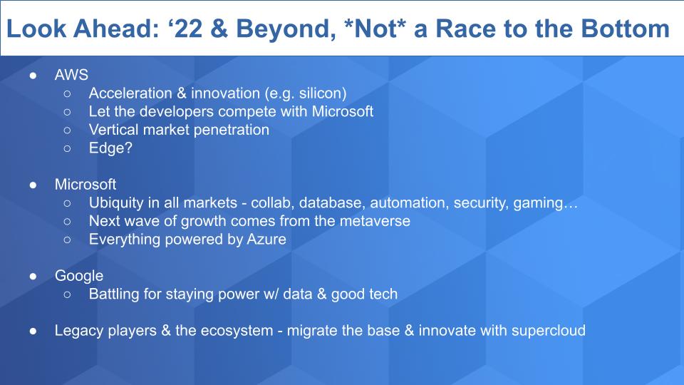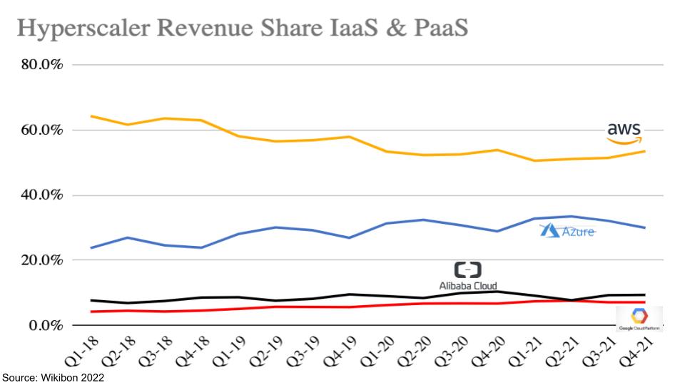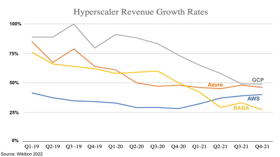 请注意,AWS扭转了其份额流失的趋势,并略有上升。AWS已经连续四个季度加速增长。去年,它占四大超级规模云公司收入的52%,第四季度这一数字接近54%。在2021年,Azure占据了超大规模云企业中32%的营收,而在第四季度这一比例降至30%。你可以看到,GCP和阿里巴巴在争夺铜牌。
