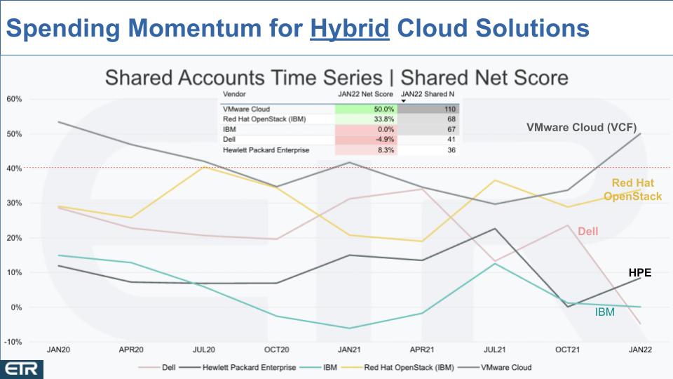 此图表显示了可追溯到2020年1月的五个云平台的净得分。请注意插入的表格,它显示了净得分和 Shared N,后者表示数据集中的提及次数,在此处列出的所有平台都在调查中显示出强大的存在,40% 的红色虚线表示支出处于较高水平。