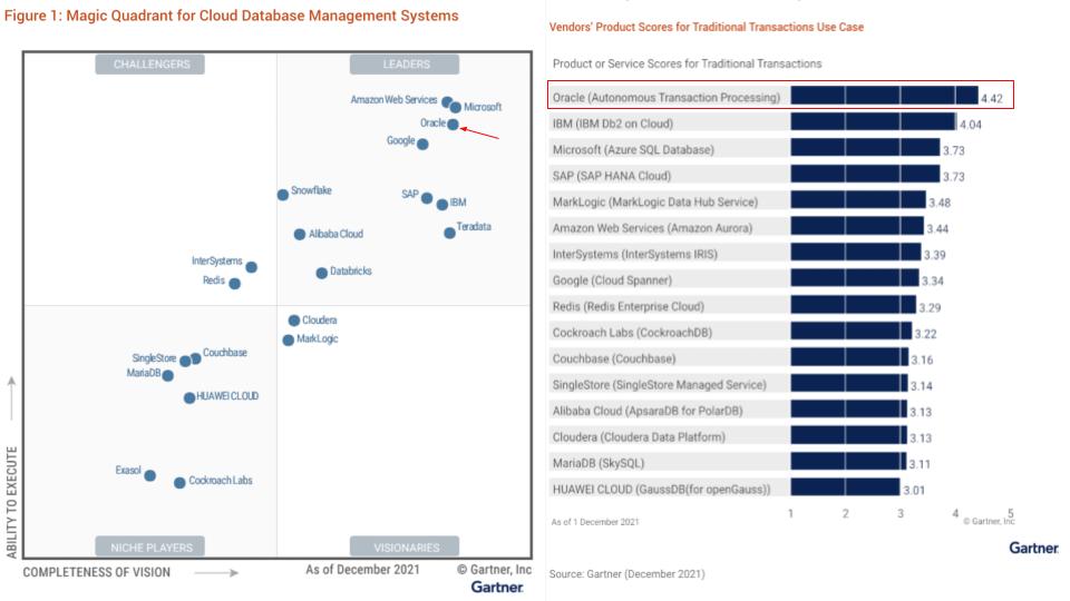 分析师高度评价Oracle的云数据库。Oracle的差异化地位有助于解释为什么Oracle是关键任务应用程序之王,例如Gartner的云数据库魔力象限和其它分析展示了Oracle处于如此有利的位置。