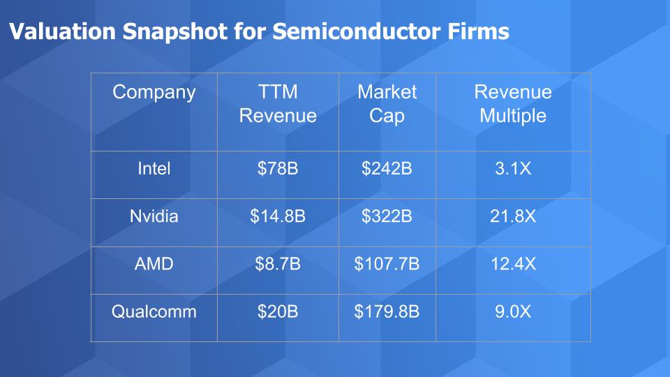 上图比较了英特尔、Nvidia、AMD和高通过去十二个月的收入和市场估值。可以看到,在TTM营收倍数为3倍的情况下,Nvidia约22倍,AMD和高通约10倍。