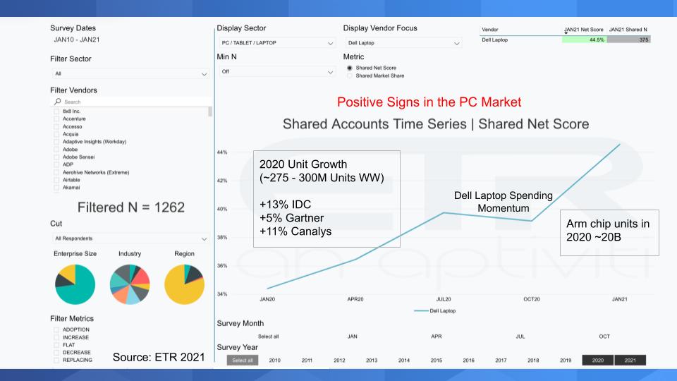 以下是ETR(企业技术采购调研)数据的快照,显示了戴尔在2020年到2021年的笔记本电脑净积分或消费势头。戴尔的客户业务一直非常好,为公司带来了利润。坦率地说,这是个惊喜。从增长情况可以看出,PC的表现不错。2020年,全球PC出货量将达到2.75亿台,甚至可能高达3亿台,据估计增幅为两位数。