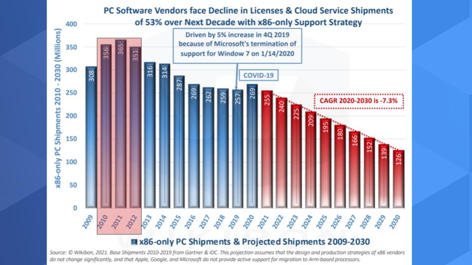 上面这张图显示的是x86 PC销量随时间的变化。红色高亮区域显示的是高峰年。2020年PC销量实际上有所增长,部分原因是COVID-19导致工作者需要支持远程办公的笔记本电脑。但销量的游戏规则已经被移动化重置了;而长达数十年的摩尔定律与莱特定律的成功节奏,已经一去不复返了。