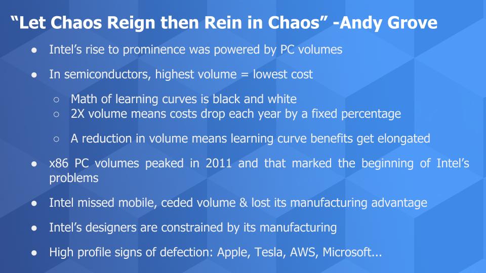 英特尔的崛起和制造业的主导地位是由PC数量推动的,其相应的是该公司围绕x86指令集创建的生态系统的发展。为什么数量在半导体行业中如此重要?这是因为产量最高的玩家拥有最低的制造成本。虽然已经有很多通过小晶圆制造实现规模经济效应,但关于学习曲线的数学是清晰而显著的。