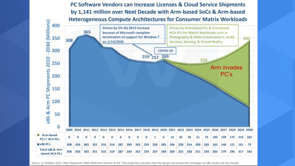 上图显示了Wikibon对基于Arm的2020年预测,以及与基于x86的PC对比。该图还包括一些其它设备,但可以看到十年末会发生什么。正如在Apple M1上所看到的那样,Arm正在慢慢蚕食PC,并在支持视频和虚拟现实系统等新兴设备上占据了更好的位置。