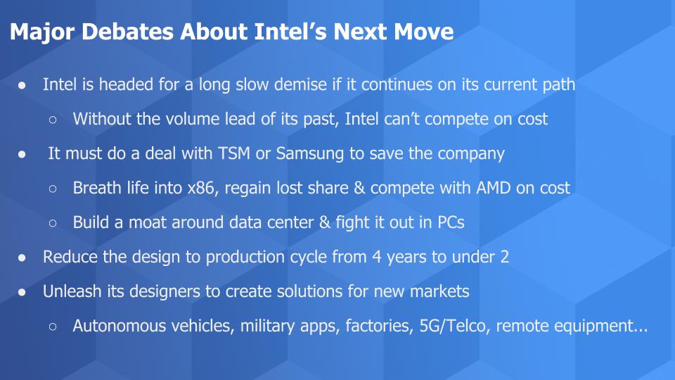 这些都是严肃的问题!而大家对应该怎么做也是众说纷纭。Wikibon听到了许多声音,从Pat应该解决执行问题而不要对Intel进行任何重大战略变革,到英特尔应该采用混合外包模式,到英特尔应该积极退出生产等等。