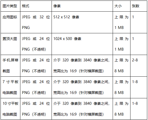 至少包括关于应用的一句话简介、完整介绍及各种宣传展示图片,以下是Google Play管理中心对上传图片的类型和要求的汇总: