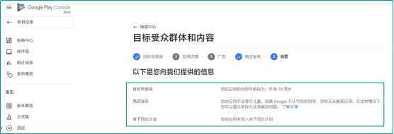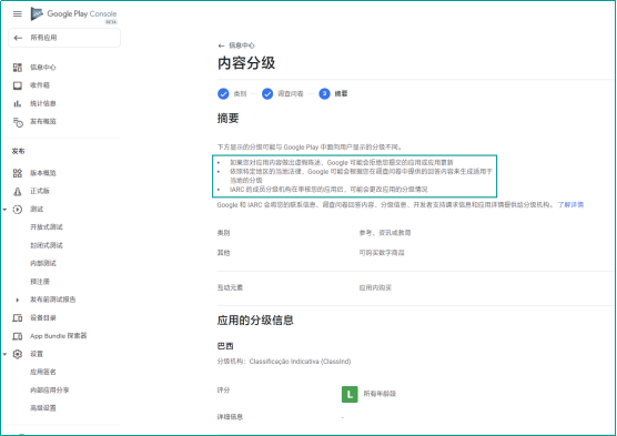 2.2.3 【内容分级】有两步,第一步是选择应用类别,第二步是填写调查问卷(主要看应用是否包含暴力、色情、令人反感的语言等内容),如实填写即可,最后官方会根据你的选择生成你的应用适合的分级摘要信息。