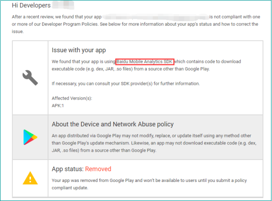 3.2.3 【检查与发布版本】以上所有过程完成之后,选择正式发布,进入官方审核应用环节,由于疫情期间,审核时间会比平时更长一些,一般3~5个工作日。如果应用审核通过,恭喜您,可以正式发布应用,并且可以在Google Play中检索到;如果应用审核未通过,会以邮件的方式告知,具体不通过的点以及修改建议,这里的例子就是我的应用第一次审核未通过,原因是应用使用了百度的移动分析工具。