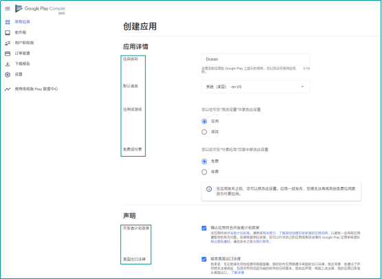 登录Google Play Console。【创建应用】包括【应用详情】和【声明】两部分,声明是确认应用符合开发者计划政策和美国出口法律,点击【创建应用】。