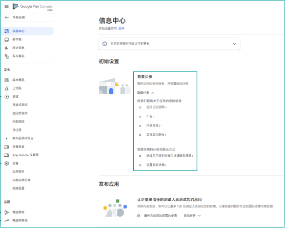 应用创建完成,进入信息中心,包括【初始设置】和【发布应用】两个模块。【初始设置】的六项内容全部填写完成后,才可以在【发布应用】模块中进行相应的操作。
