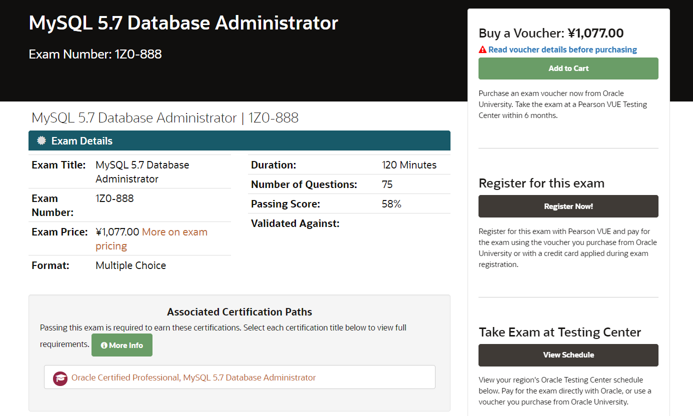 MySQL OCP 5.7的考试号是1Z0-888,120分钟的考试时间需做完75选择题,考题形式为单选和多选,正确率达到58%可通过考试。考试费目前为人民币1077元。