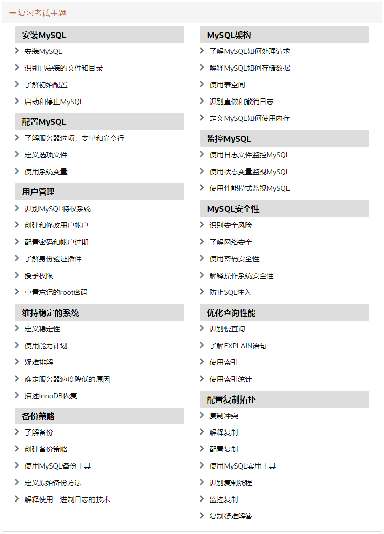 目前网络上5.7 OCP相关的资料还比较少,在备考上相对Oracle OCP难度稍高,更考验个人的基本功,下面我将考试介绍中大纲部分的内容粘贴如下,共涉及10个主题。