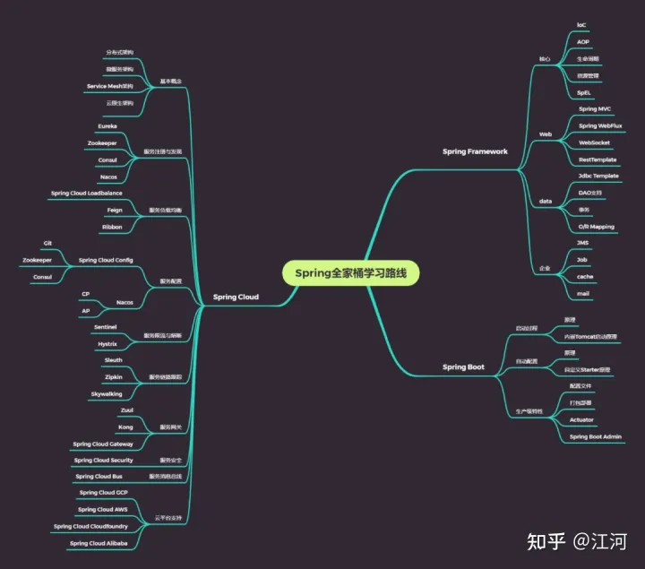 一名合格的Java后端工程师或架构师,至少 Spring Framework、Spring Boot、Spring Cloud 这三者是必须牢牢掌握的,这里也整理了整套Spring全家桶学习路线,准备作为福利送给大家,可以先看一下重点简图。