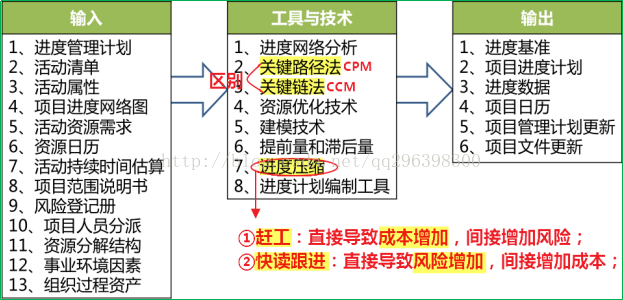 ②快速跟进:通过并行交叉作业来压缩进度工期的一种技术。适用于可并行交叉的项目,会直接导致风险的增加。