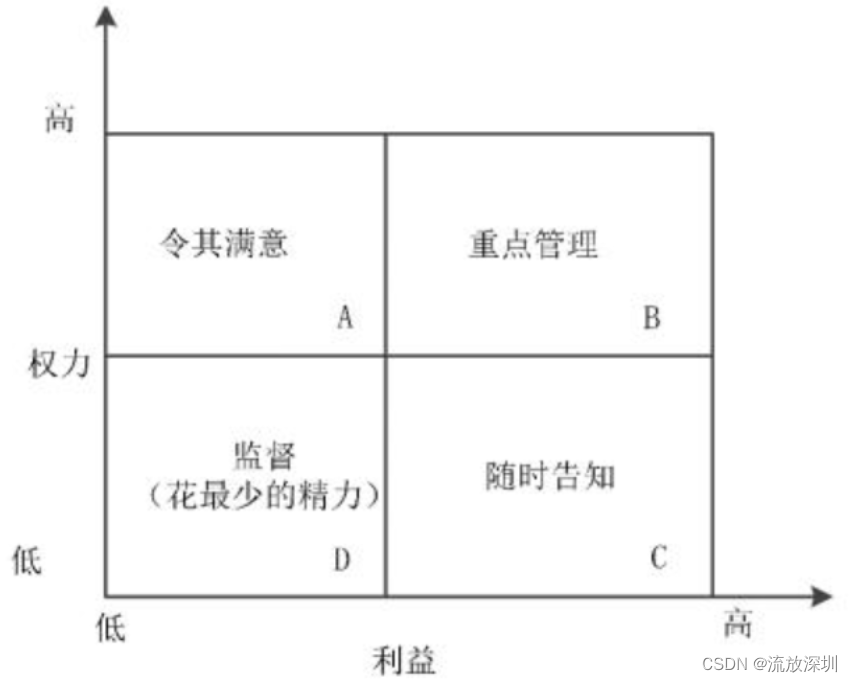 权力/利益方格是根据干系人权力的大小,以及利益对其分类。这个矩阵指明了项目需要建立的与各干系人之间的关系的种类。