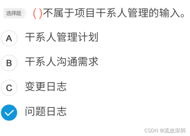 干系人管理输入包括:干系人管理计划、沟通管理计划、变更日志、组织过程资产。问题日志属于干系人管理输出。