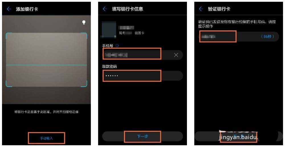 3、填写银行卡(扫描或手动输入银行卡号,请注意核对信息)——填写银行卡信息——验证银行卡——添加成功