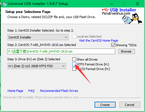 选择我同意,进入如下界面,现在的服务器基本上都是支持UEFI启动但是也不乏可能出现不支持的情况,所以我们在选择镜录的时候选择cnetos installer,这里需要注意一点买一个好点的U盘因为刻录的时候会复制centos镜像至U盘,而镜像的大小为4GB+,所以U盘的文件系统需要为NTFS格式箭头所示的地方√上。