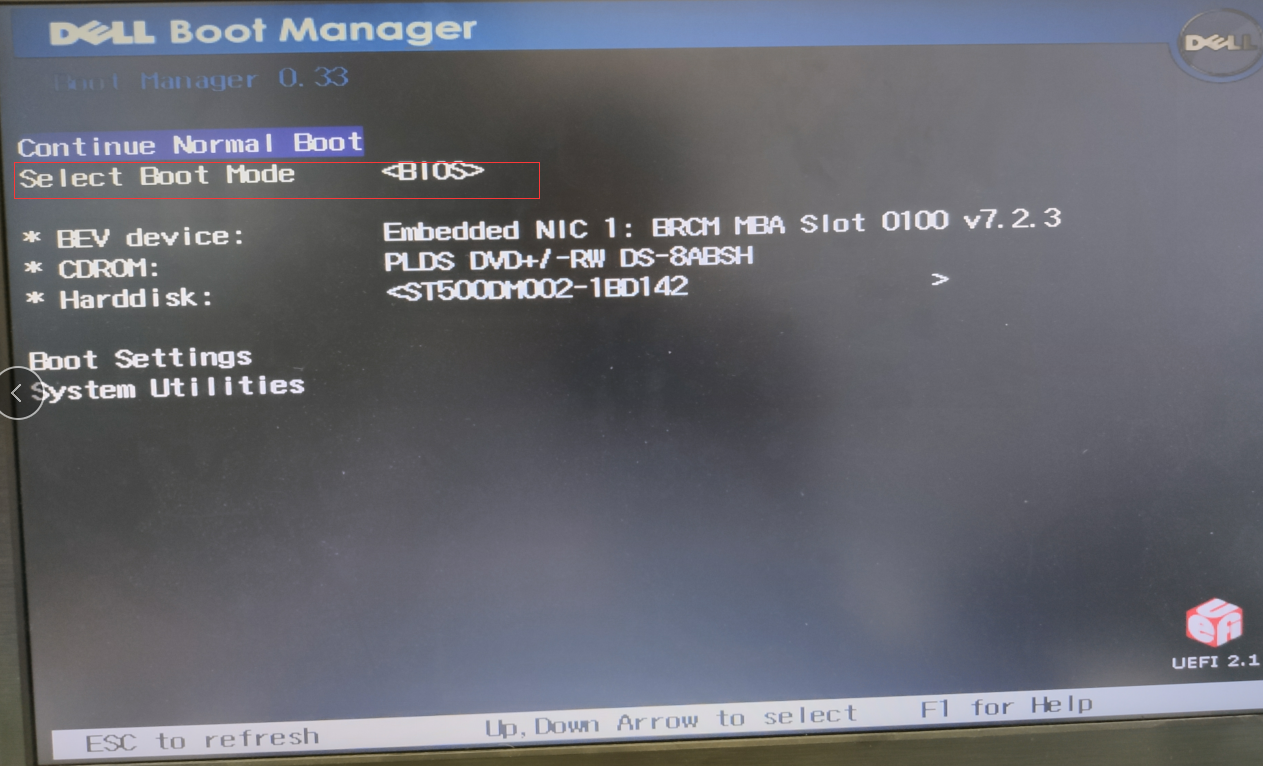 如下图我们进入的为戴尔启动管理(dell boot manager)设置启动模式为bios,图中红框所示,不同型号的服务器可能设置方法有差异,但只要记住两点第一boot manager这个是开机时键盘要选择的看好是哪个按钮,第二启动模式(boot mode)设置为bios。