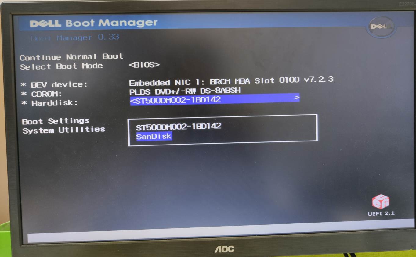 再之后选择启动的硬盘为插入的U盘,这里我使用的为闪迪的U盘可以看到图中所示为sandisk(闪迪)。↓键选择后按enter键,即可从U盘引导。