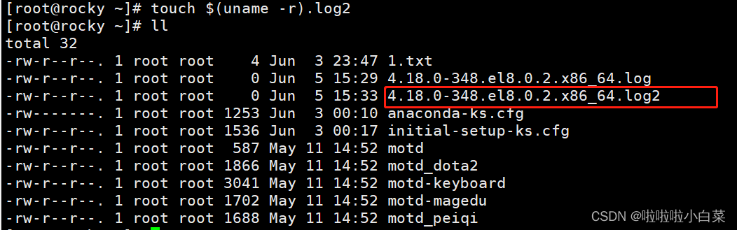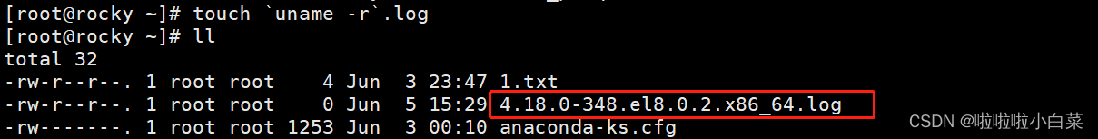 - touch `uname -r`.log,把uname -r命令执行的结果作为touch的参数创建对应的文件