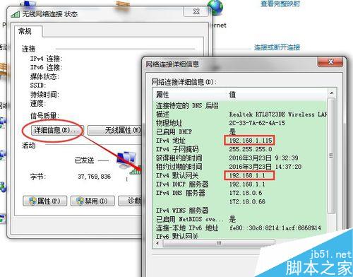 在网络连接状态中,点击详细信息,在弹出的窗口中,IPv4 地址就是我们电脑的内网IP地址.下面的IPv4 默认网关就是我们路由器的地址.