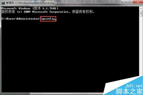 进入DOS界面后,我们在命令行,输入Ipconfig命令,然后按下Enter.