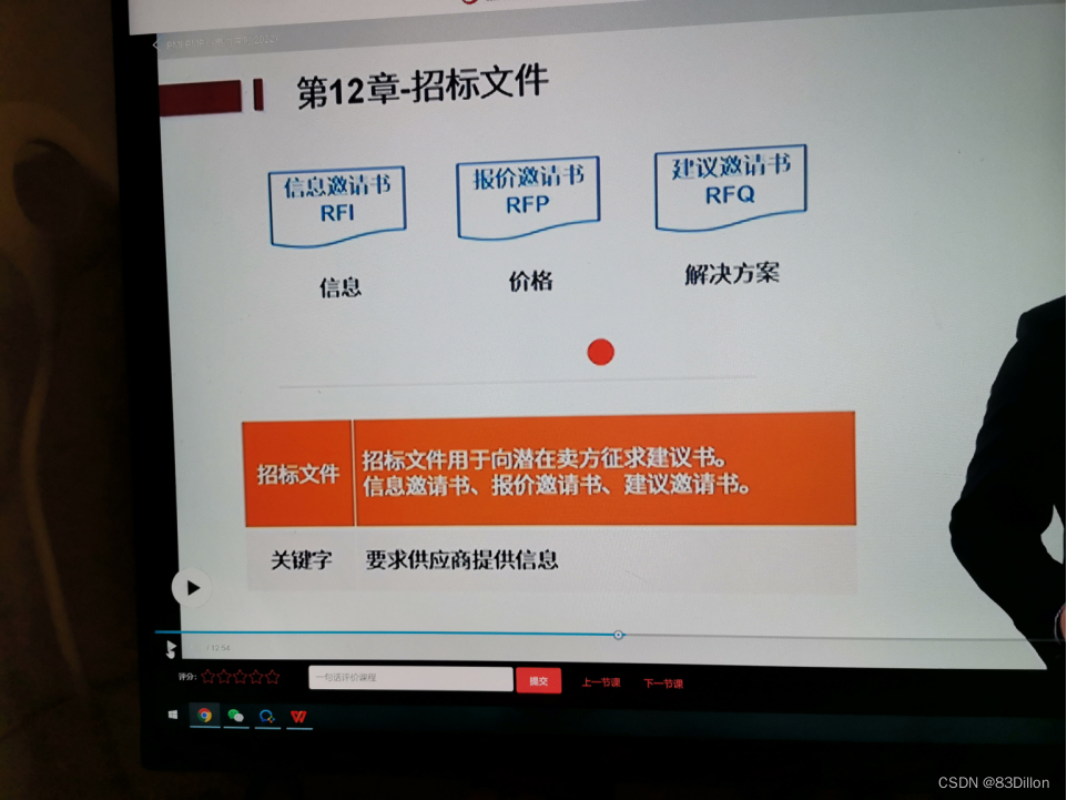 招标文件:信息邀请书(RFI)(买方需要卖方提供关于拟采购货物和服务的更多信息);报价邀请书(RFQ)(提供关于将如何满足需求和需要多少成本的更多信息);建议邀请书(RFP)(提供完整的解决方案,遵守的时间表,卖方应答有关额严格采购规则)
