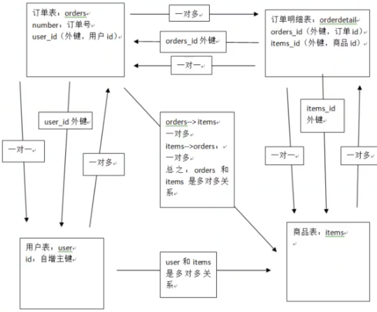 items->orderdatail:一个商品可以存在于多个订单明细中,一对多